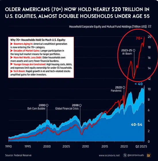 - Older Americans own more equities than EVER: Americans aged 70+ hold ~$20 TRILLION in US equities, an all-time high. Their holdings have more than DOUBLED since 2020.They are now holding TWICE as much as those aged under 55. This is at a time when the biggest bubble of all-time has begun to spring a leak, and this age group can ill-afford losses.
