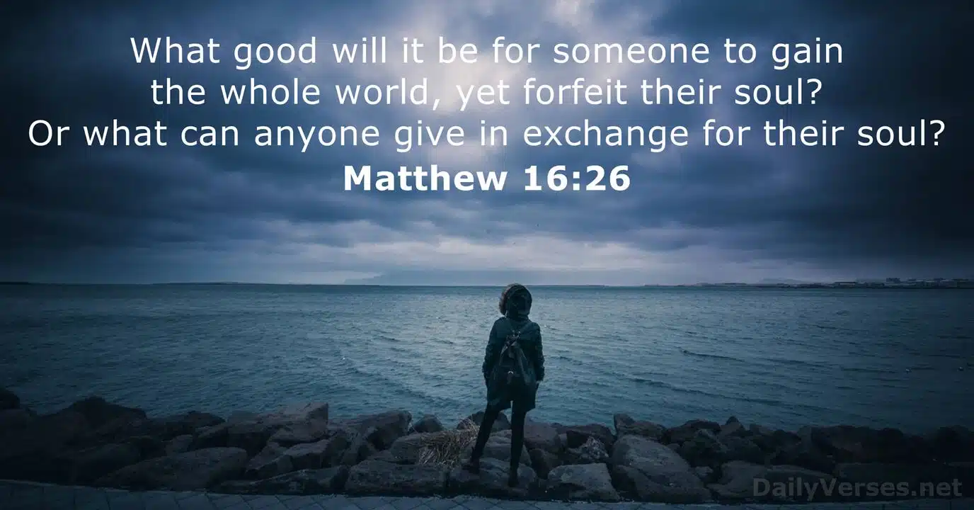 Matthew 16:26 asks a profound rhetorical question: “What good will it be for someone to gain the whole world, yet forfeit their soul? Or what can anyone give in exchange for their soul?” It emphasizes that earthly wealth and success are worthless compared to eternal life, urging disciples to prioritize their spiritual selves over worldly gains.